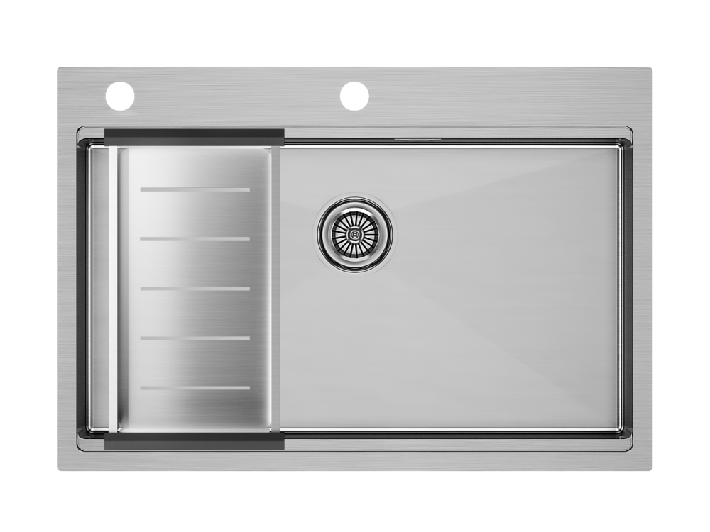 Прочный материал мойки позволяет избежать деформации от большого веса посуды и продуктов и обладает устойчивостью к термическим воздействиям. Мойка легка в уходе и чистке, а также имеет дополнительное отверстие для установки дозатора или кнопки для измельчителя, что помогает оборудовать рабочее пространство так, как вам удобно.