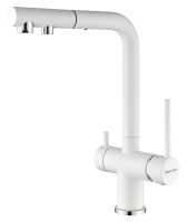 Смеситель оснащен гибким выдвижным изливом из нейлоновой оплетки, которая обладает отличной устойчивостью к истиранию и разрушению. Данная техническая особенность расширяет рабочую зону смесителя, позволяя пользоваться им с удобством в больших мойках, мойках с двумя чашами, или наполнять водой ёмкость на столе рядом с мойкой, в том числе питьевой водой.